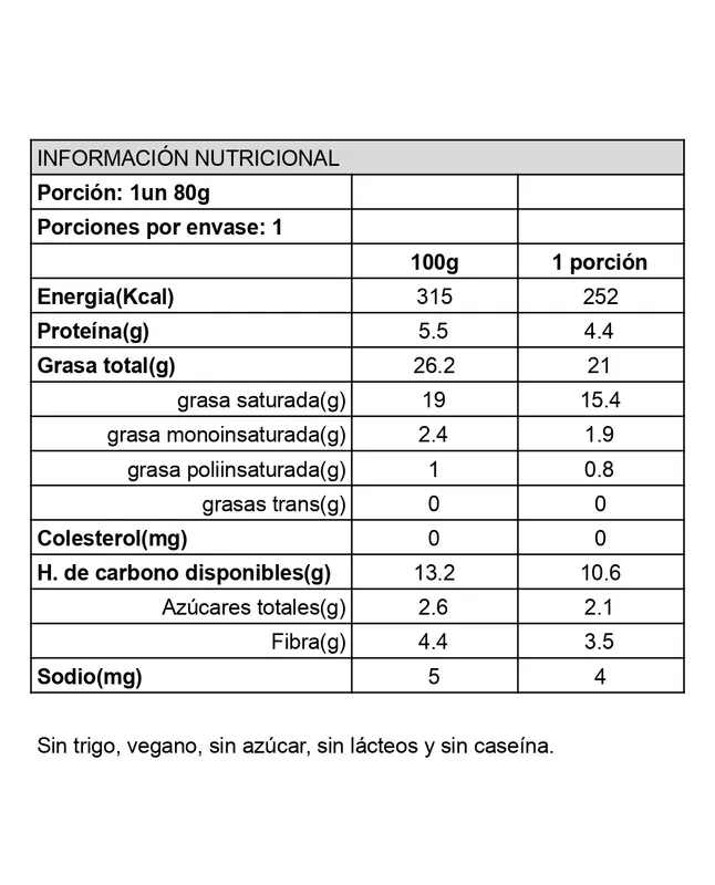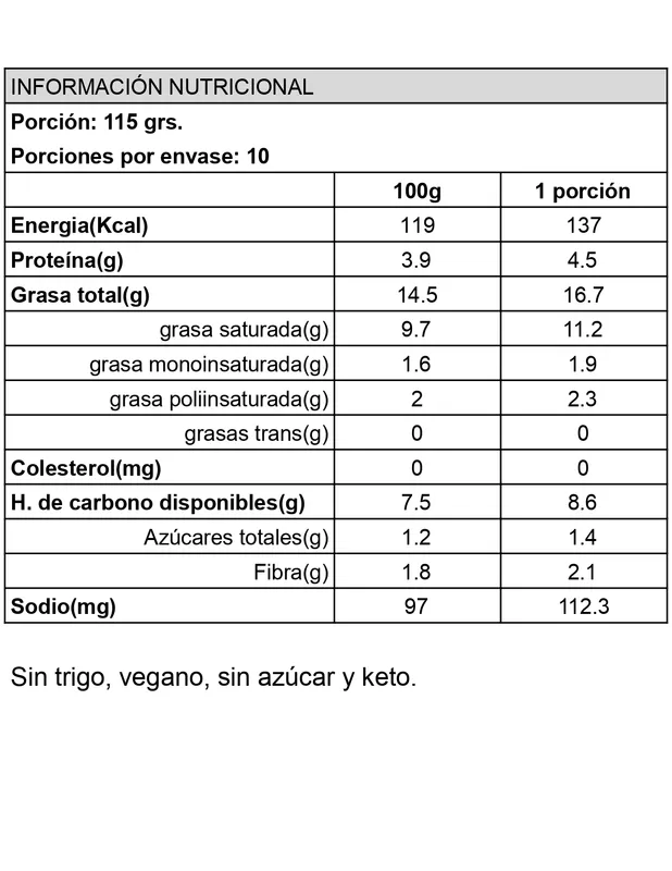 Muy inclusiva, ya que no contiene azúcar, trigo, ni lácteos de ningún tipo. Apto para personas con diabetes, apto para dieta anticándida.